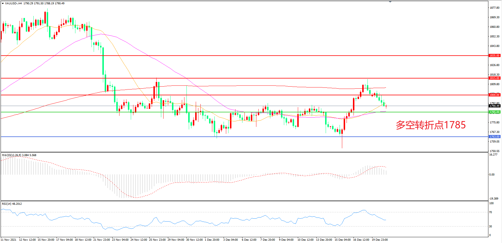 周一(12月20日),奥密克戎毒株迅速蔓延打压市场中的风险情绪,但圣诞节假期临近,清淡的交易量容易放大市场波动让多头不敢轻举妄动,金价小幅调整后收报1790.57美元/盎司。在疫情、通胀等多重潜在利多的支撑下,需要注意的是目前多头是否能够收复并收稳于1800美元/盎司之上,是本周黄金能否开启涨势的关键。