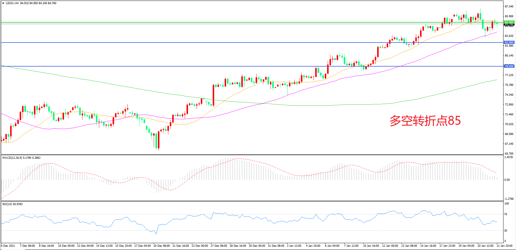4小时图看,油价连续上行后小幅回落,但上行趋势依然未受到破坏,55周期均线成为下方支撑,85美元成为多空分水岭,MACD红柱缩短,RSI指标走平,日内延续震荡概率较大。