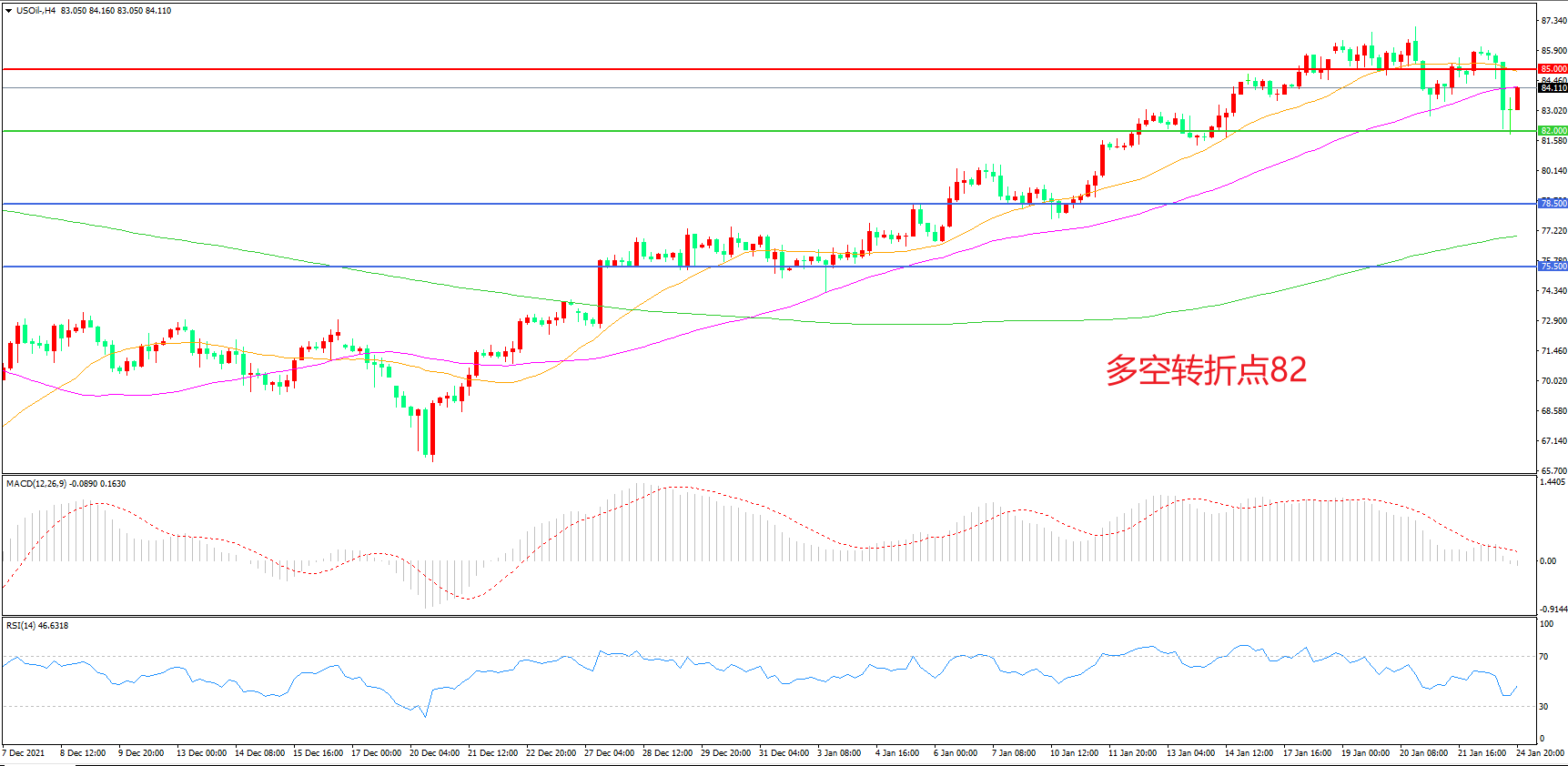 周一(1月24日),乌克兰紧张局势加剧,但美国需求走软的迹象令投资者担忧,多空交织之下,美国WTI原油冲高回落,收报84.14美元/桶。由于俄罗斯和阿联酋等相关国家均是OPEC+重要成员,可能加剧市场对供应紧张的担忧,俄乌冲突和中东局势进一步升级也证明油价存在风险溢价合理,短期油价延续高位震荡概率较大。