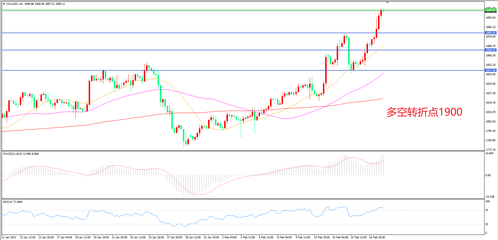 4小时图看,金价自长阳连续拉升,短线走势偏强,1900成为多空分水岭,MACD红柱增加,RSI指标走平,日内震荡上行概率较大。