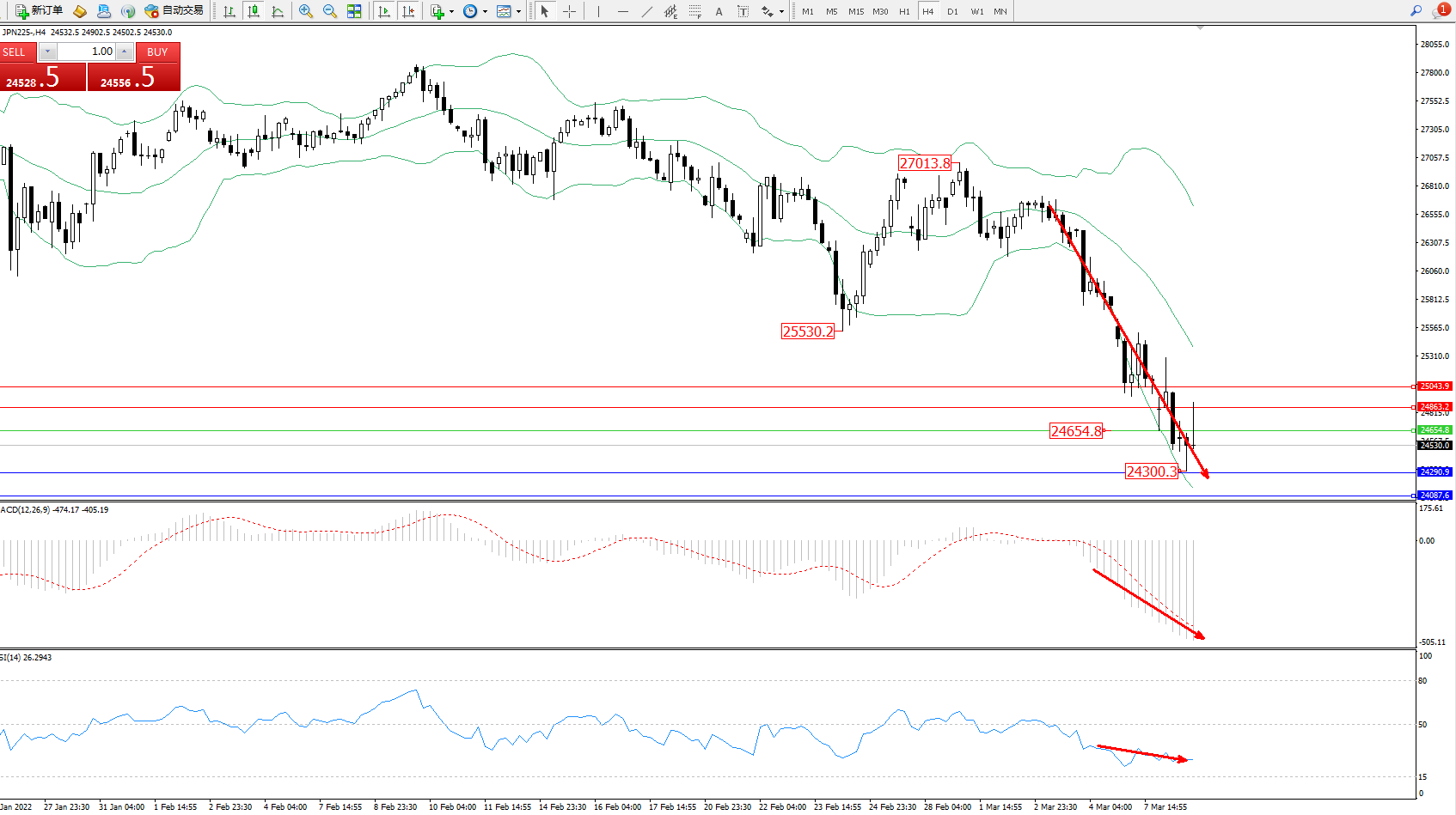 日经指数JPN225——4小时K线图显示: