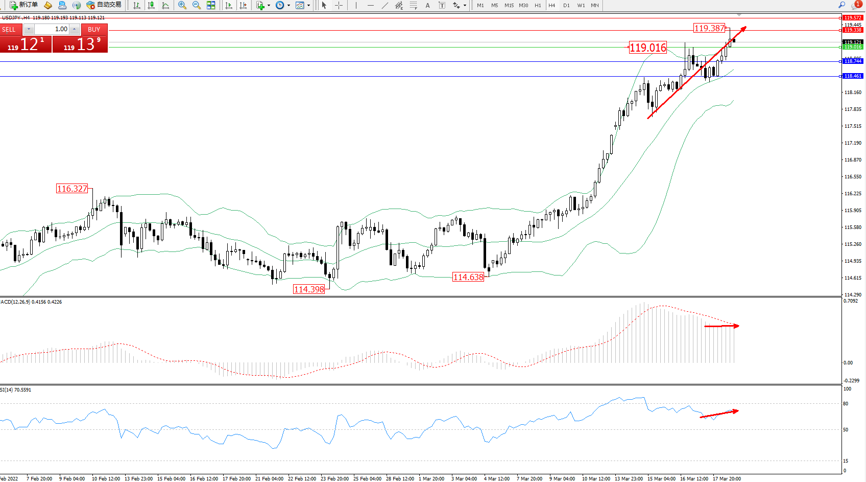 技术点评:多头动力延续布林带指标通道中上轨区间持续震荡上扬,高位抵达119.387位置节点后整理,短期多头动力有进一步向上移动态势,布林带指标呈收口走势后开始有缓慢张口迹象,且多头上扬态势良好,MACD指标处于多头区域维持整理平移,RSI指标处于多头区域维持整理徘徊中;
