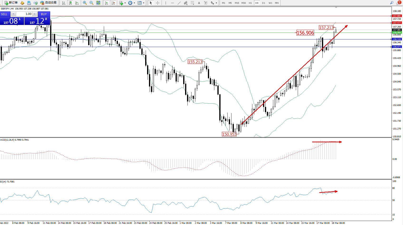 技术点评:多头动力延续布林带指标通道中上轨区间持续震荡上扬,高位抵达157.213位置节点后开始震荡,短期多头动力有进一步上扬态势,布林带指标呈上行趋势走势态势良好,MACD指标处于多头区高位维持整理平移,RSI指标处于多头区域维持高位徘徊中;