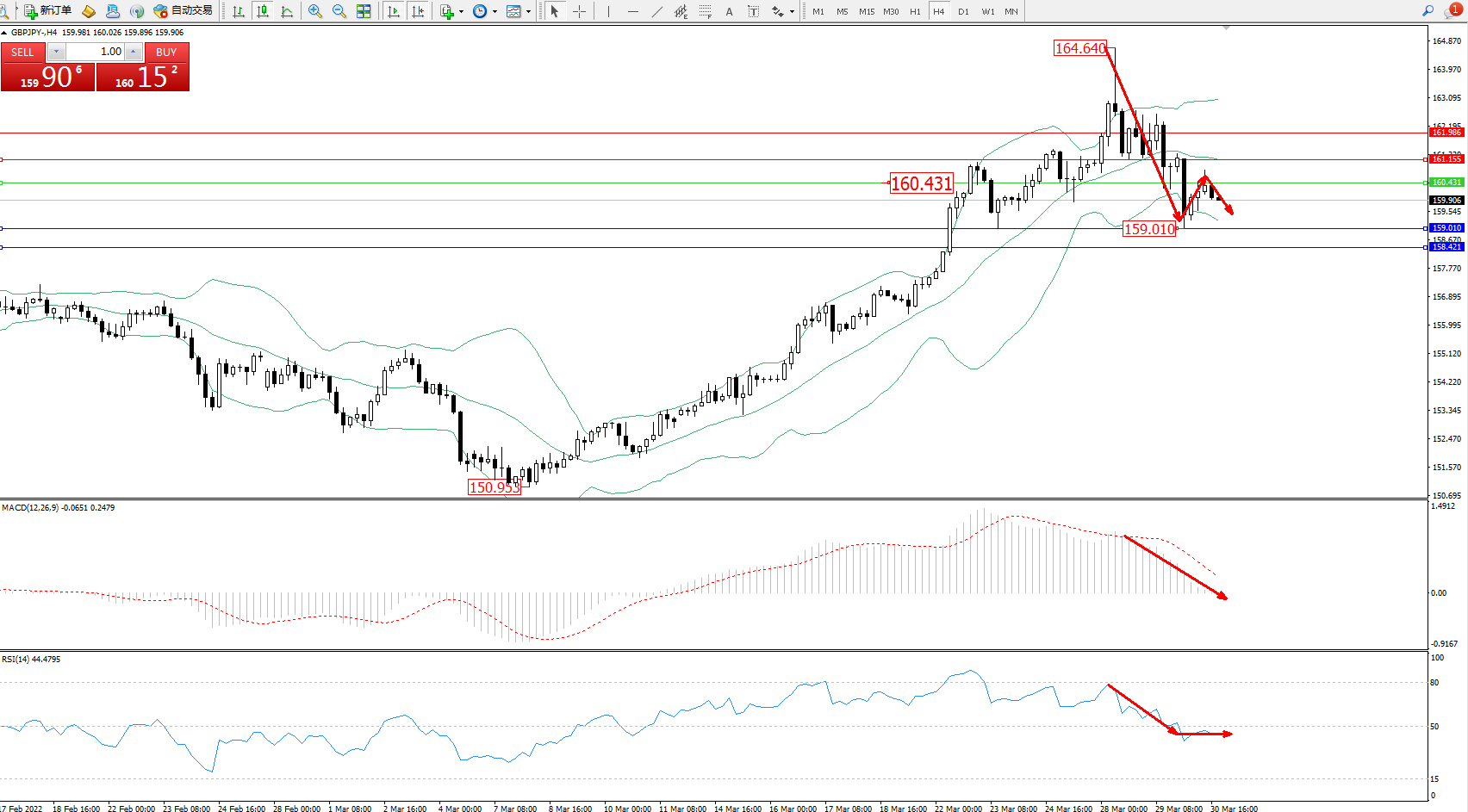 交易策略:160.431下方看跌,目标159.010、158.421