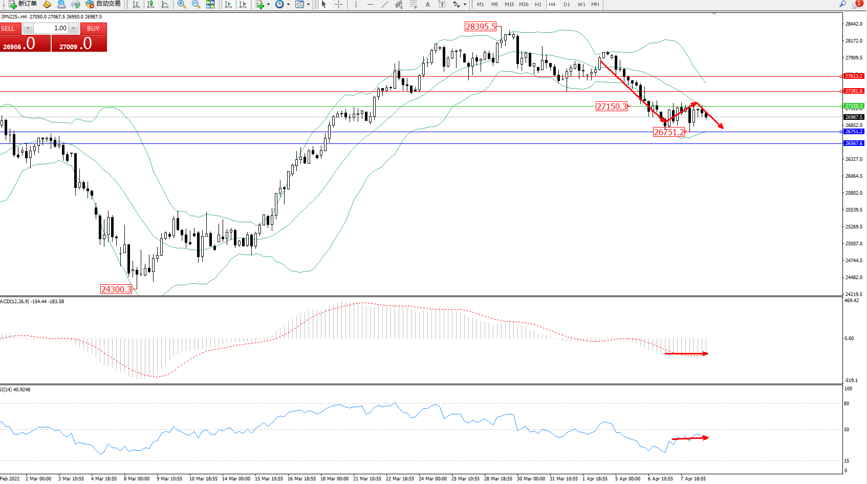 技术点评:空头动力延续布林带指标通道中下轨区间持续震荡下行,低位抵达26751附近节点后开始整理平移,短期空头动力有继续向下移动迹象,布林带指标呈收口走势持续中,MACD指标处于0轴线下方空头区域维持整理平移,RSI指标处于50均衡线下方空头区域窄幅整理中;