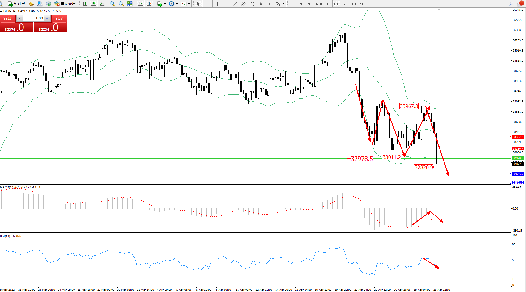 道琼斯指数4月29日(周五)收盘下跌970.77点,跌幅2.86%,报32945.62点;美股三大股指集体低收,道指收跌近千点。投资者越来越担心美国利率上升、乌克兰战争和新冠疫情恶化可能对全球经济复苏产生的影响。随着波动飙升和越来越多的利空消息回荡,这已经成了一个典型的短线交易市场,科技公司的前瞻放大了市场对美联储变得更加鹰派的担忧,再加上仍然棘手的供应链问题,另外能源价格上涨使美联储“软着陆”的希望变得更加渺茫。