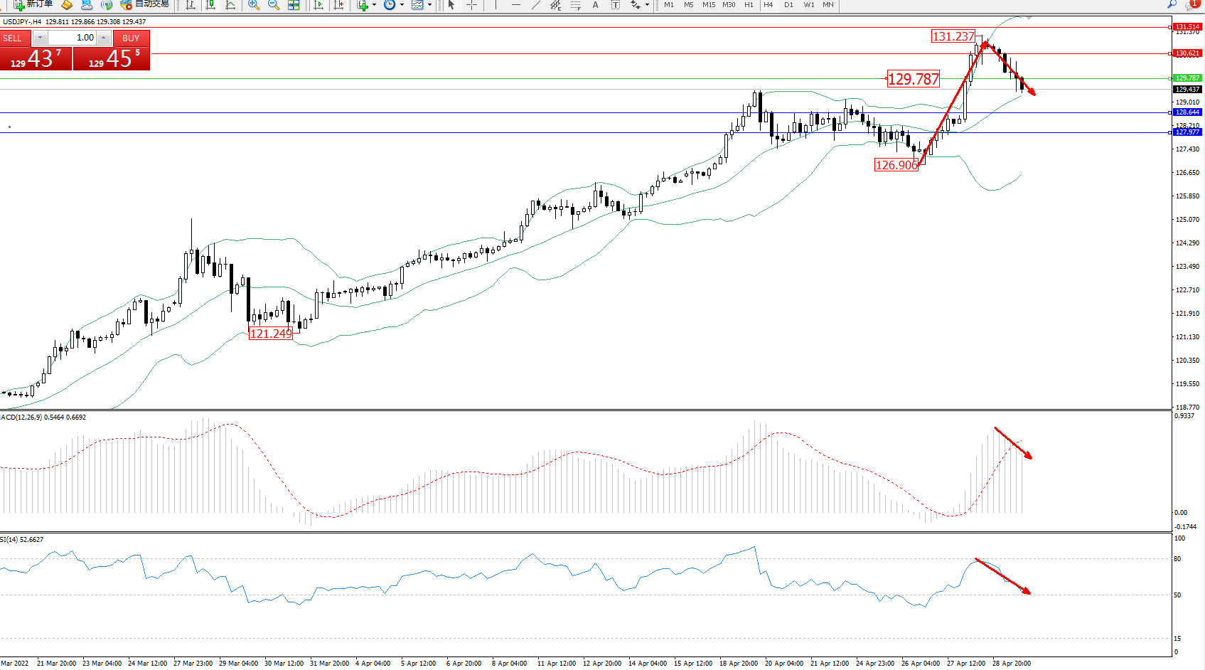 技术点评:多头动力延续布林带指标通道中上轨区间持续震荡上扬,高位抵达131.237位置附近遇阻回撤,短期触及布林带指标中轨附近节点后整理,布林带指标呈收口走势中,MACD指标处于多头区域高位反转下行,RSI指标处于多头区域高位维持震荡下挫中;