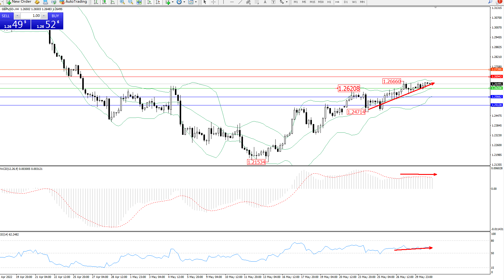 技术点评:多头动力延续布林带指标通道中上轨区间持续震荡上扬,高位抵达1.26660附近节点后开始弱势整理平移,短期多头动力有继续向上移动态势,布林带指标呈上行趋势走势态势良好,MACD指标处于多头区域维持整理持续平移,RSI指标处于50均衡线上側维持弱势徘徊中;
