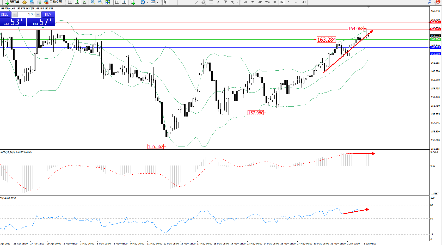 交易策略:163.284上方看涨,目标164.015、164.514