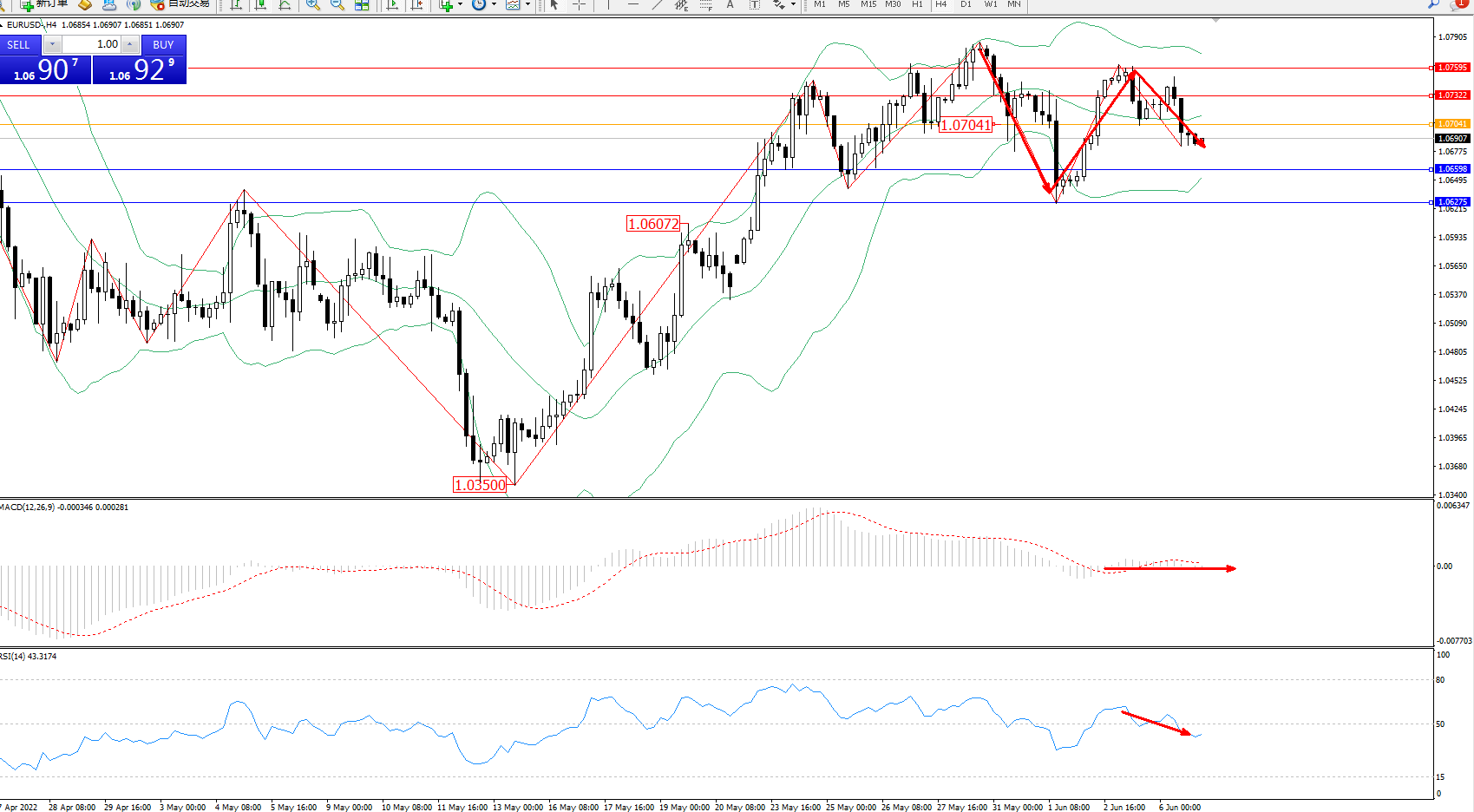 欧元兑美元维持1.06907附近震荡,由于欧洲央行在控制通胀方面一直落后,不少大的机构分析预测年内欧央行必将有大的加息举动。一旦欧央行加息展开,则在息差方面会逐渐缩小与美联储的距离。在此情形下,欧元也会因此收到一定的抬捧。