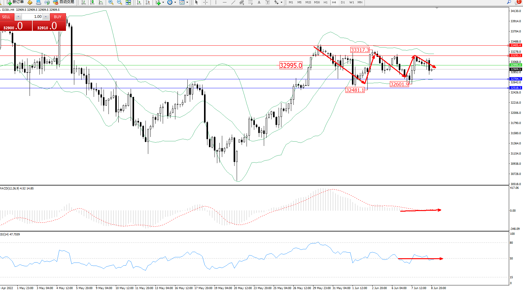 交易策略:32995下方看跌,目标32704、32518