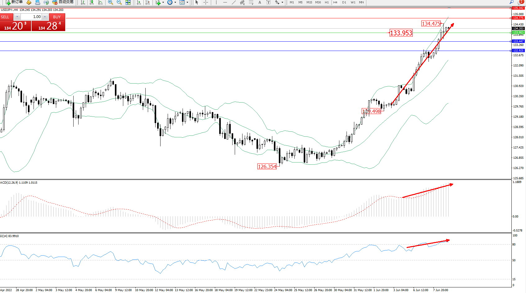 技术点评:多头动力延续布林带指标通道上轨附近持续震荡上扬,高位抵达134.475附近节点后整理,短期多头动力有继续攀升态势,布林带指标呈上行趋势走势持续中,MACD指标处于多头区域维持不断上扬中,RSI指标处于多头区域超买区80均衡线上側徘徊中;