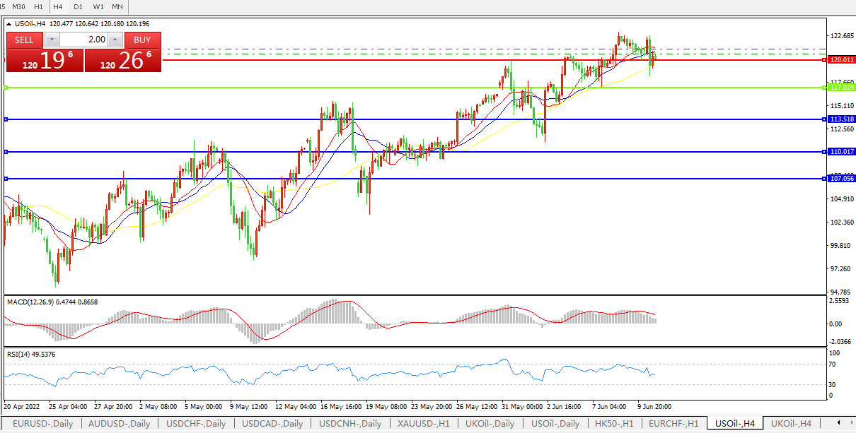 4小时图看,油价运行于均线附近,短线继续盘整概率较大, MACD动能柱逐步缩短,RSI指标持续弱势,日内继续走弱概率较大。