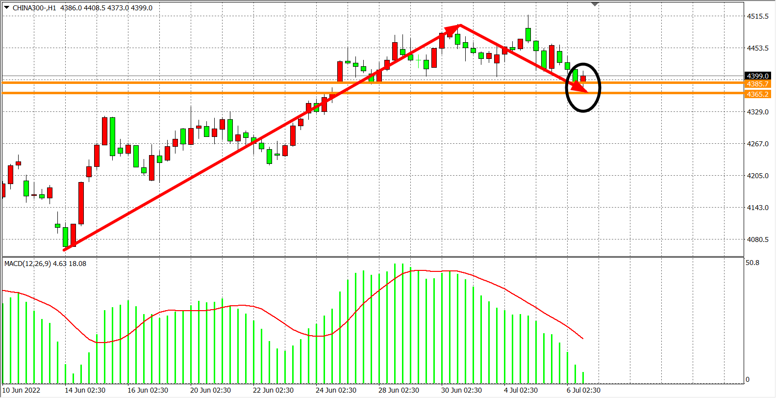 1小时图看,沪深300回调4385-4365区域支撑后出现止跌,MACD在顶背离后量能急剧缩短,显示调整行情进入尾端,日内在4365之上仍是多头趋势,下破4365才能确定趋势转空。日内重点关注4365,在此位之上仍以偏多头看待