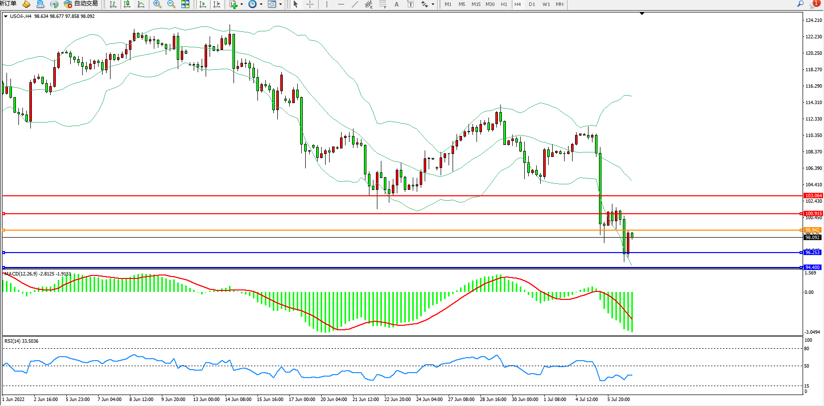 交易策略:98.942下方看跌,目标96.253、94.400
