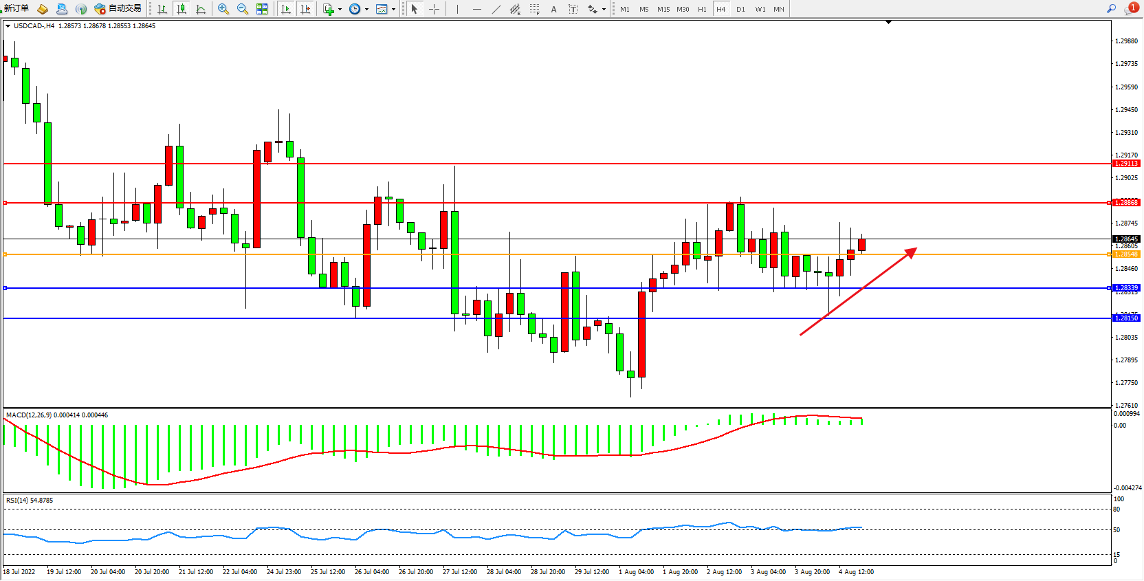 4小时图看:多头动力维持窄幅整理缓慢拉升,短期多头动力或维持弱势向上移动走势,MACD指标处于0轴线上側弱势徘徊,RSI指标处于50均衡线上側窄幅整理;
