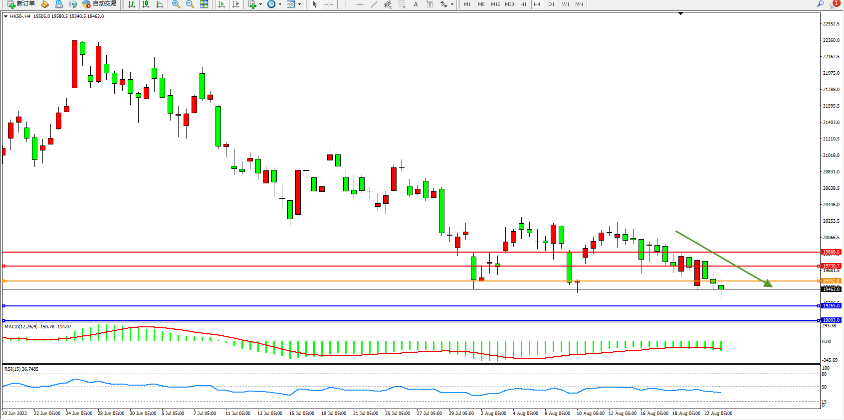 香港恒生指数8月23日(周二)收盘下跌153.73点,跌幅0.78%,报19503.25点;港股午后跌幅进一步扩大,三大指数盘中均跌超1%。恒生科技指数跌0.26%。南下资金净流入9.6亿港元,大市成交额为866亿港元。大型科技股多数上涨未能支撑大市飘红,南下资金自8月12日至今已连续8个交易日净卖出美团,累计约46.3742亿港元。