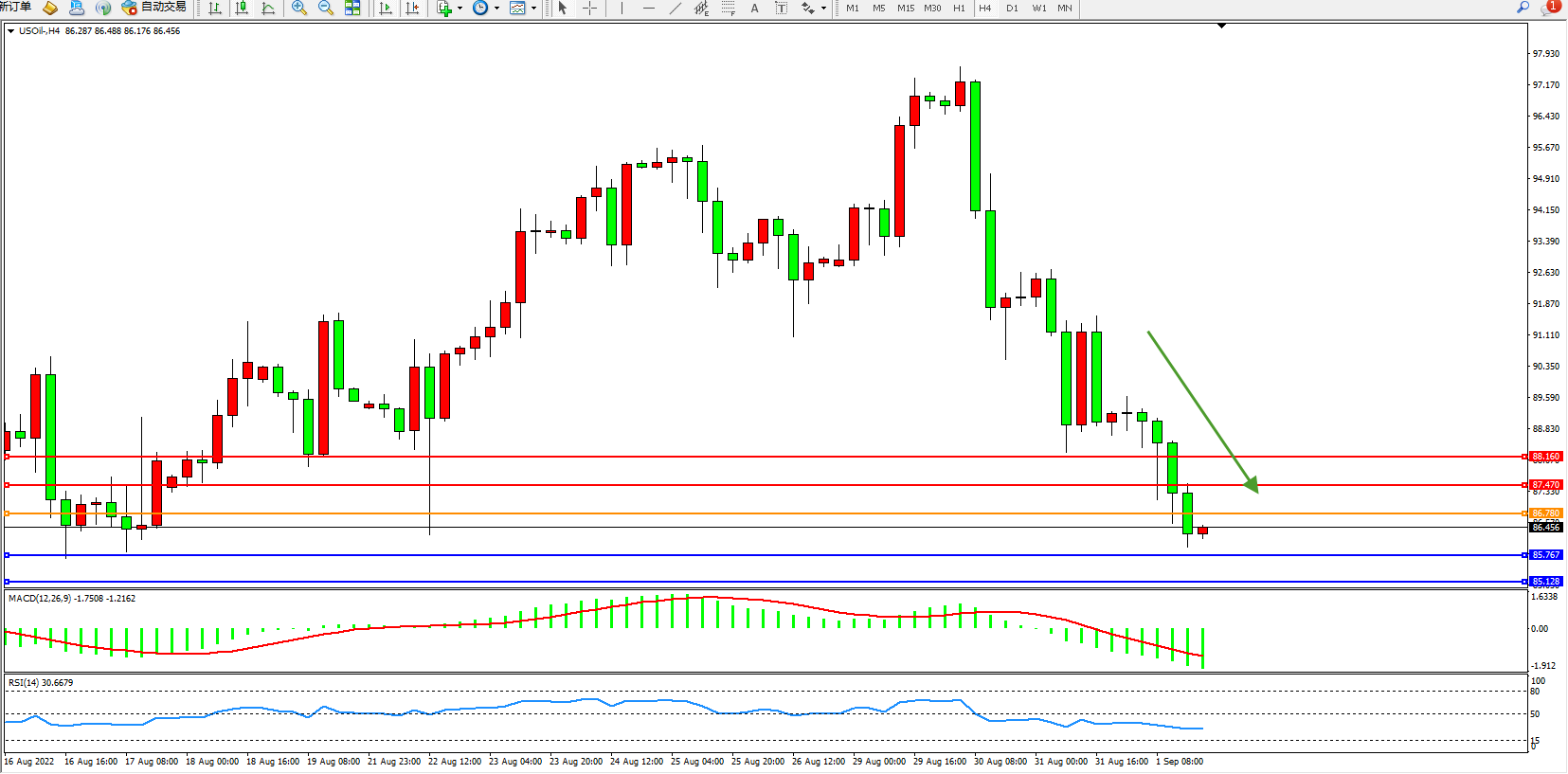 交易策略:86.780下方看跌,目标85.767、85.128