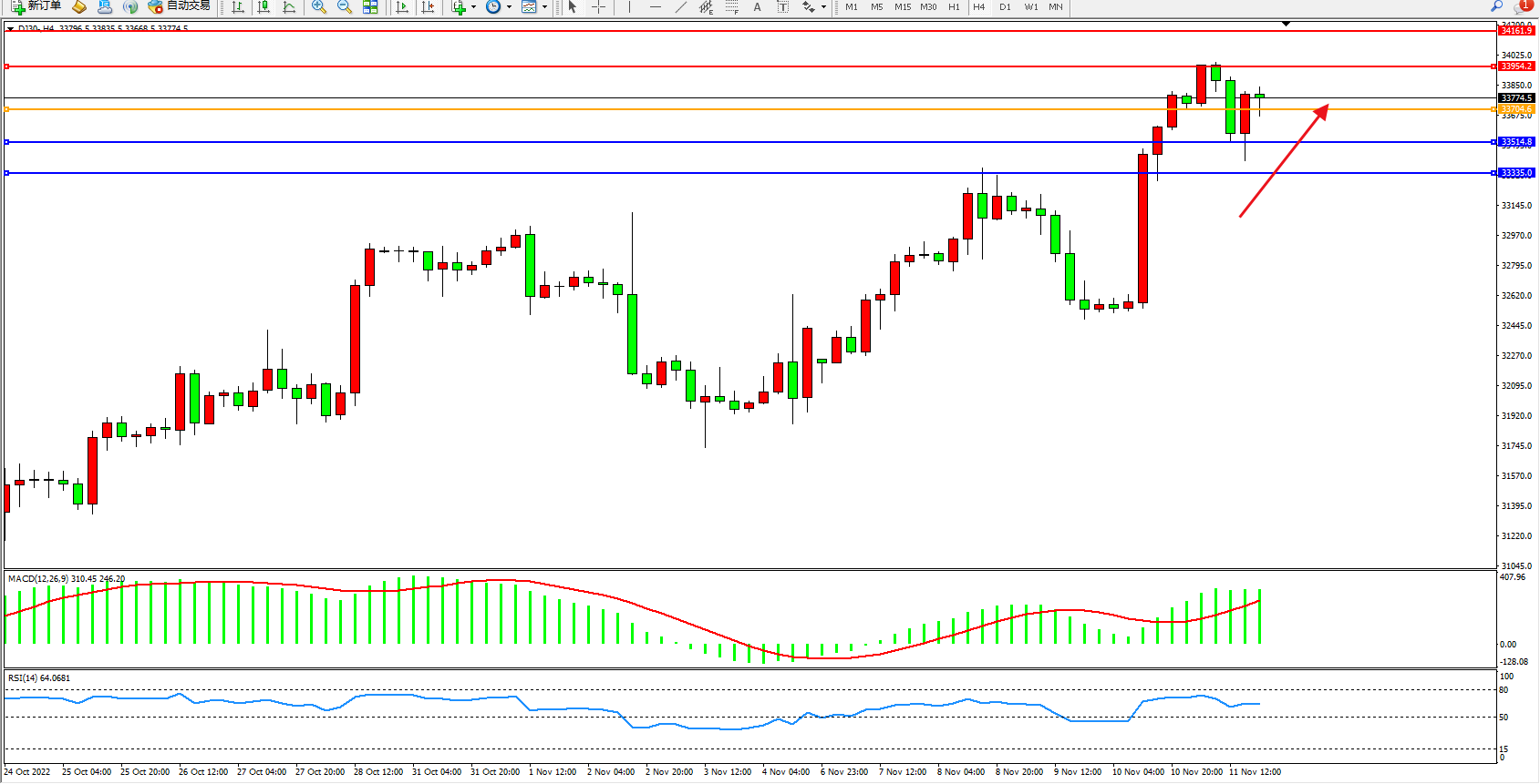 交易策略:33704上方看涨,目标33954、34161