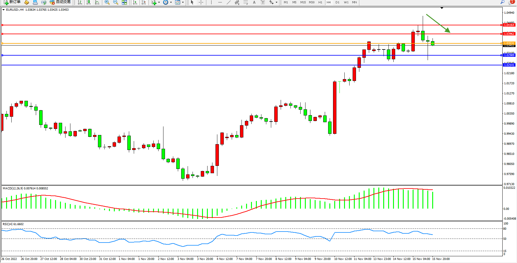 欧元美元EURUSD—4小时K线图显示: