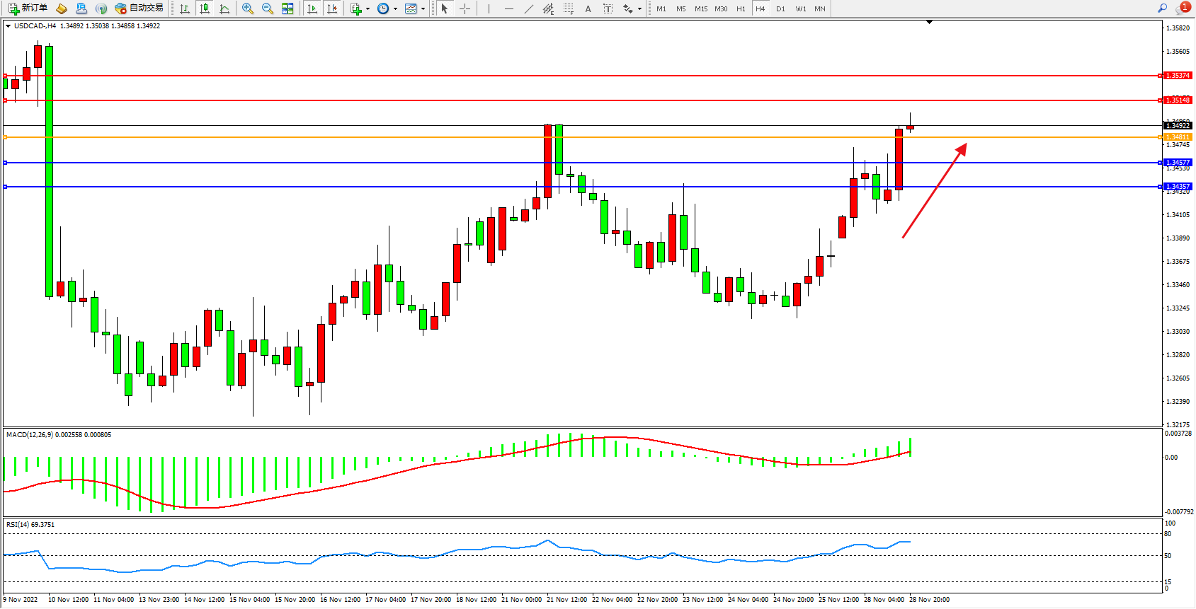 4小时图看:多头动力持续攀升上扬,短期突破此前高位后整理,市场整体处于持续拉升走势,MACD指标处于多头区域上移,RSI指标处于多头区域维持整理;