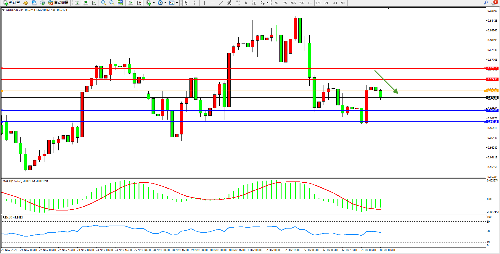 澳元美元AUDUSD——4小时K线图显示: