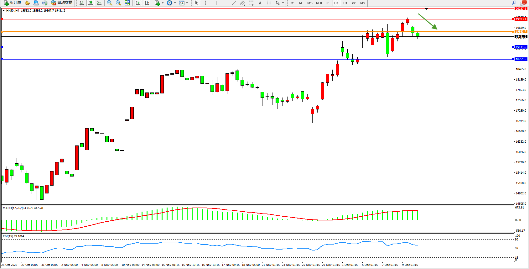 香港恒生指数12月12日(周一)收盘下跌437.24点,跌幅2.2%,报19463.63点;港股三大指数全天呈低开低走行情,市场整体情绪趋弱。恒生科技指数大幅收跌4.05%,恒指、国指分别跌2.2%和3.01%。大型科技股齐挫,美团、百度跌7%,阿里巴巴、京东、腾讯、小米皆有跌幅;感染者居家中医药诊疗指引发布,中医药股全天强势领涨,山东新华制药飙升近54%,南下资金逆势净流入86.54亿港元,大市成交额为1587亿港元。