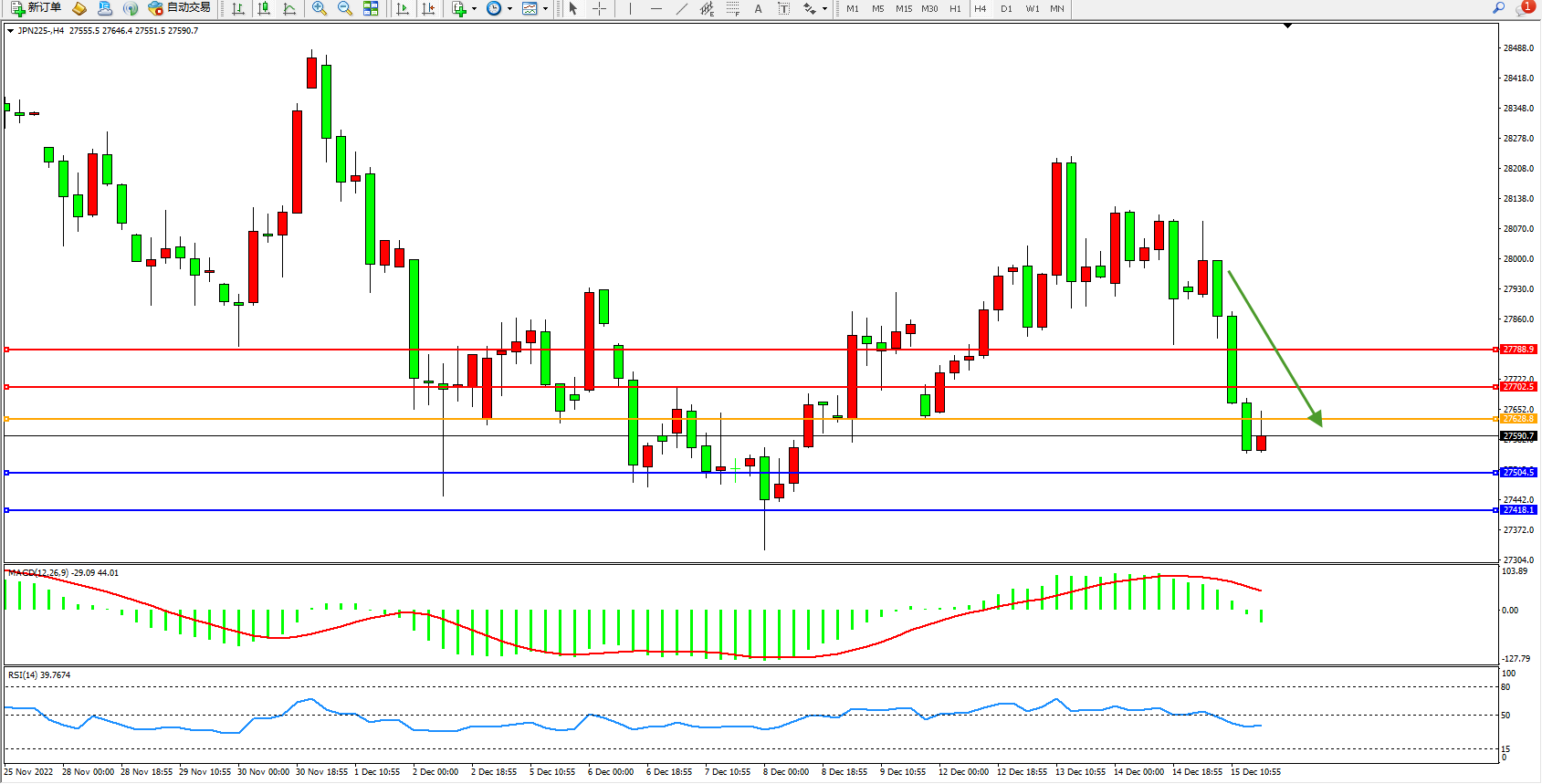 日经225指数12月15日(周四)收盘下跌129.34点,跌幅0.46%,报28036.50点。日本11月未季调商品贸易帐 -2274亿日元,预期-16803亿日元,前值-21623亿日元。