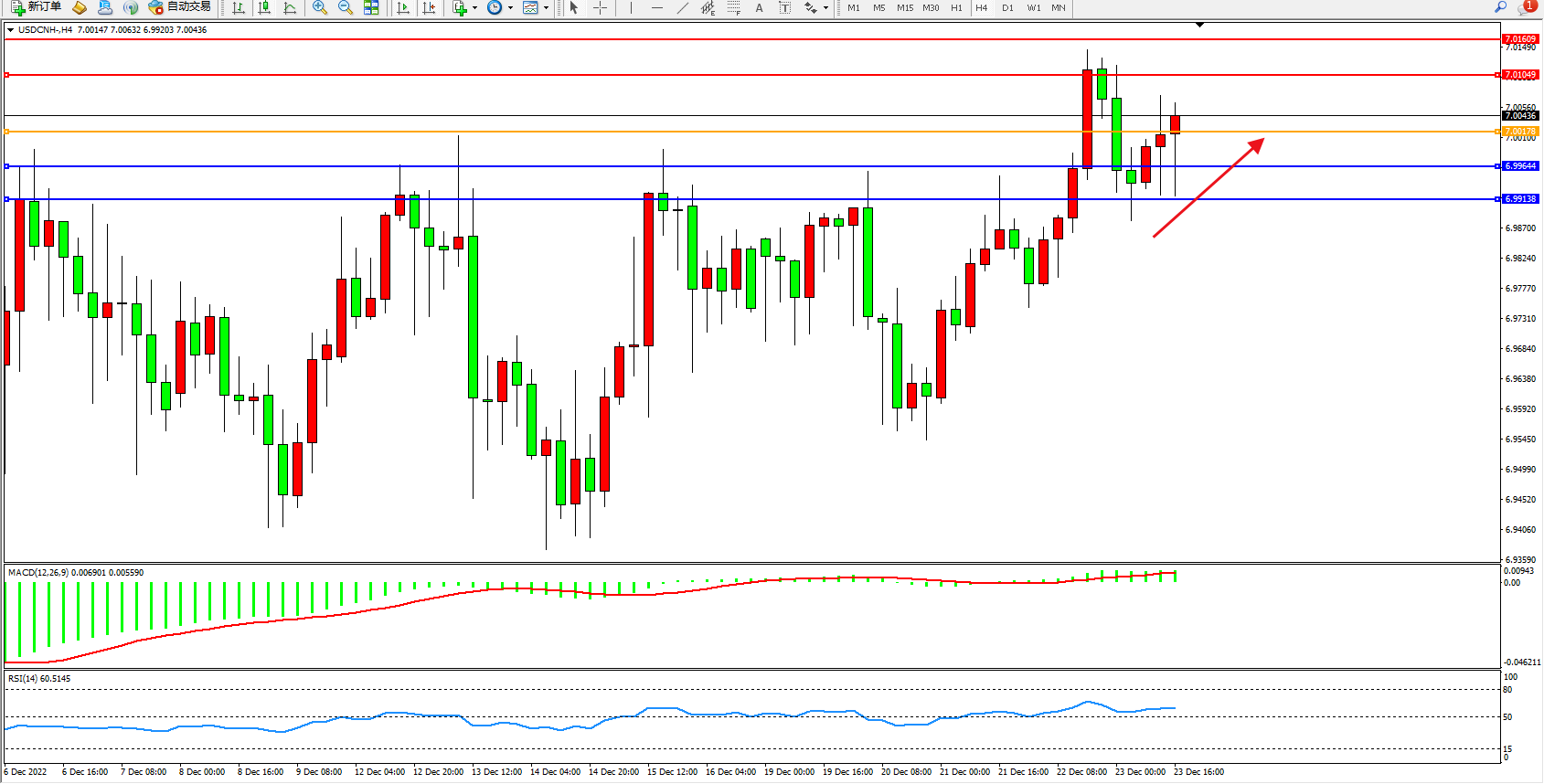 交易策略:7.00178上方看涨,目标7.01049、7.01609