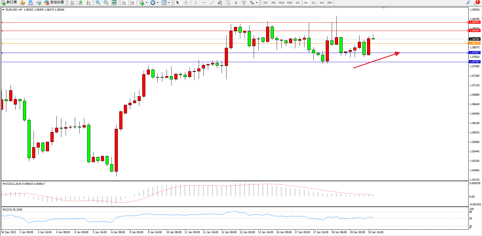 交易策略:1.08176上方看涨,目标1.08494、1.08704