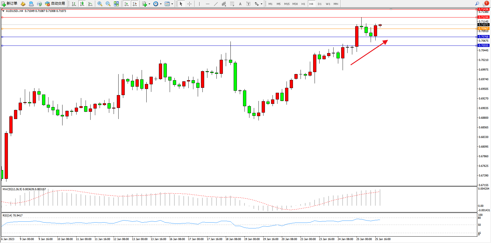 交易策略:0.70967上方看涨,目标0.71244、0.71436