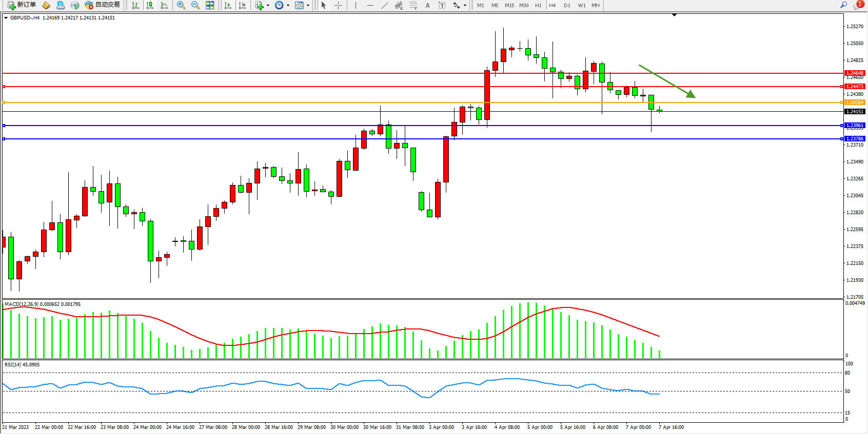 4小时图看:高位空头动力维持震荡下移,短期跌势或将延续,市场空头情绪逐渐下行,MACD指标处于多头区域震荡下行,RSI指标处于50均衡线附近整理下移;