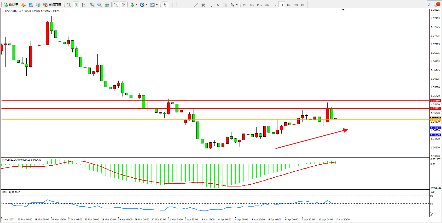 4小时图看:低位多头动力维持震荡缓慢上行,市场看涨情绪依旧,短期多头动力有继续向上移动迹象,MACD指标处于0轴线上側徘徊,RSI指标处于50均衡线附近弱势整理;