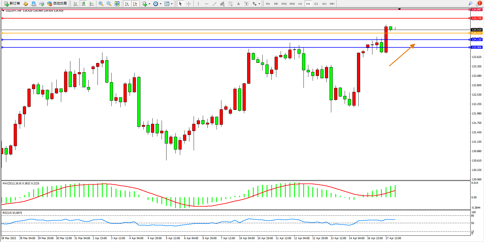 4小时图看:多头动力高位震荡上扬,短期看涨情绪依旧,市场多头不断拉升中,MACD指标处于多头区域持续上行,RSI指标处于多头区域维持窄幅整理;