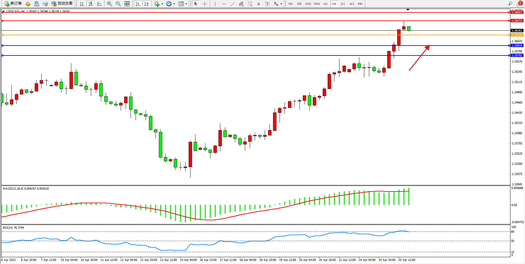 4小时图看:多头动力高位拉升,市场多头情绪持续,短期有继续上行迹象,MACD指标处于多头区域高位整理,RSI指标处于多头区域超买区80均衡线附近徘徊;