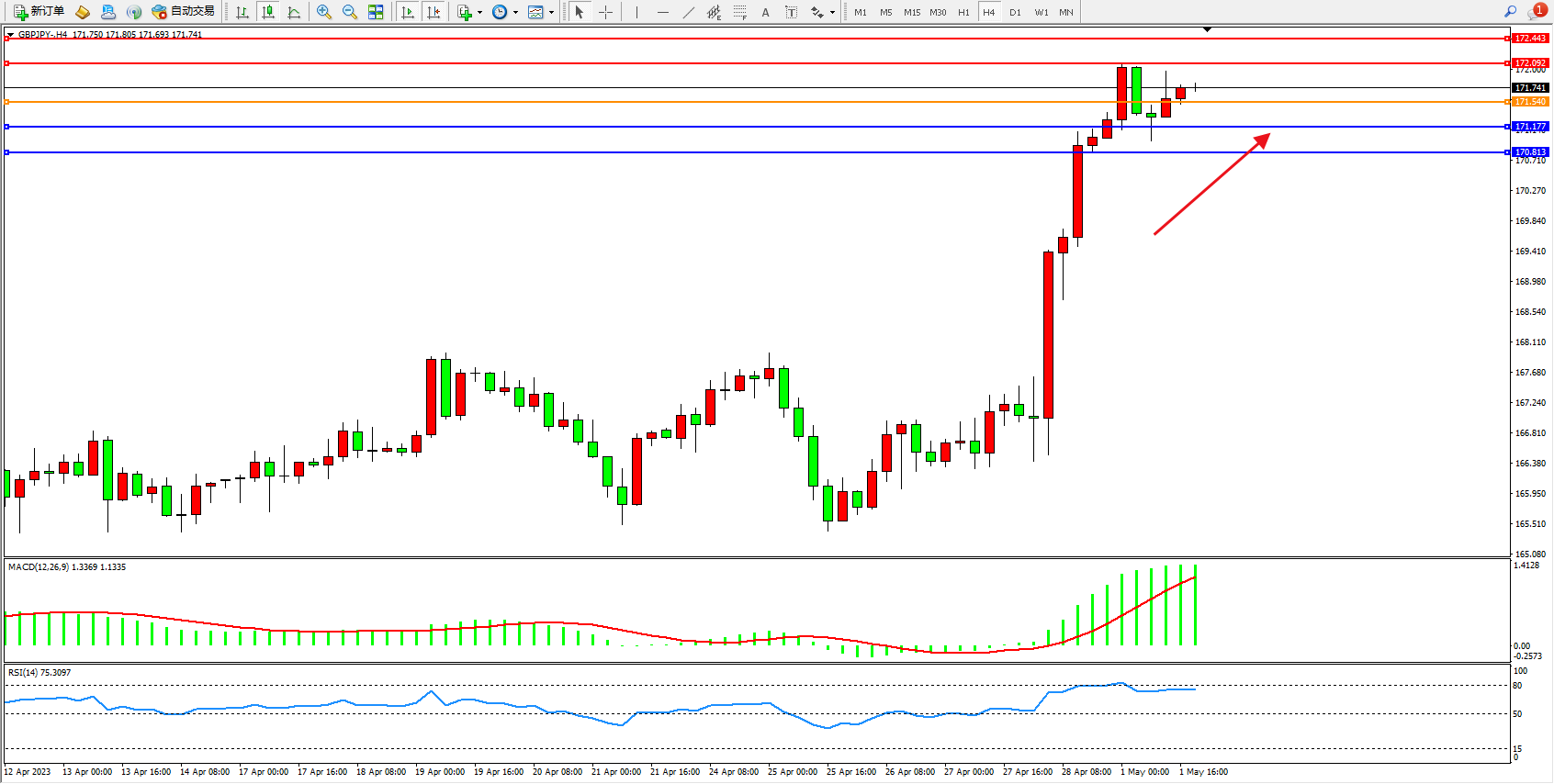 4小时图看:多头动力强势拉升后,高位短期窄幅整理,市场多头情绪依旧,高位有继续上移迹象,MACD指标处于多头区域高位整理,RSI指标处于多头区域高位80均衡线下侧徘徊;