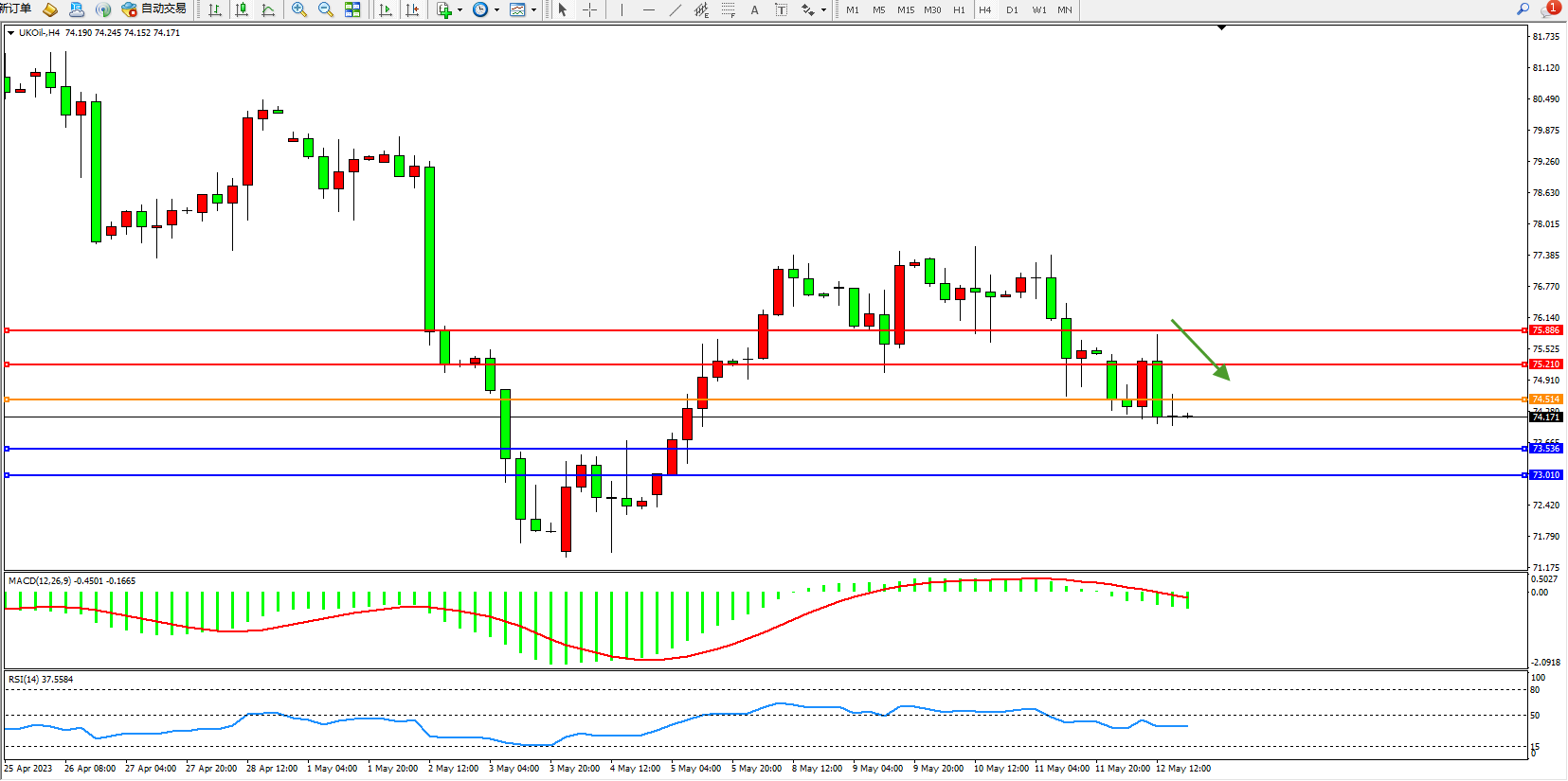 交易策略:74.514下方看跌,目标75.536 73.010