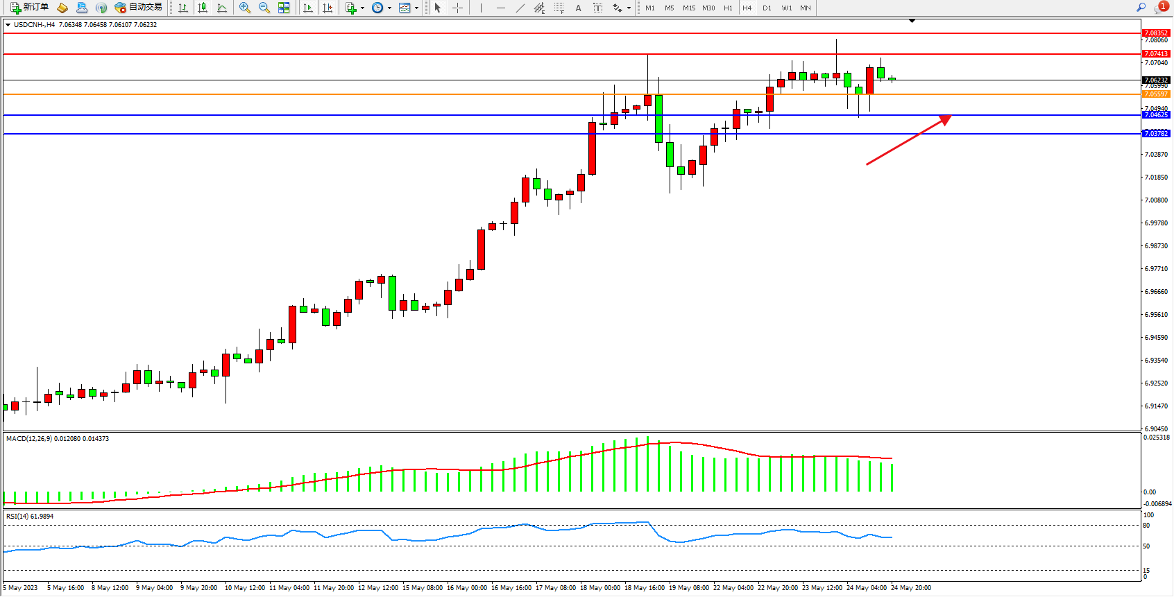 备选策略:7.05597下方看跌,目标7.04625  7.03782