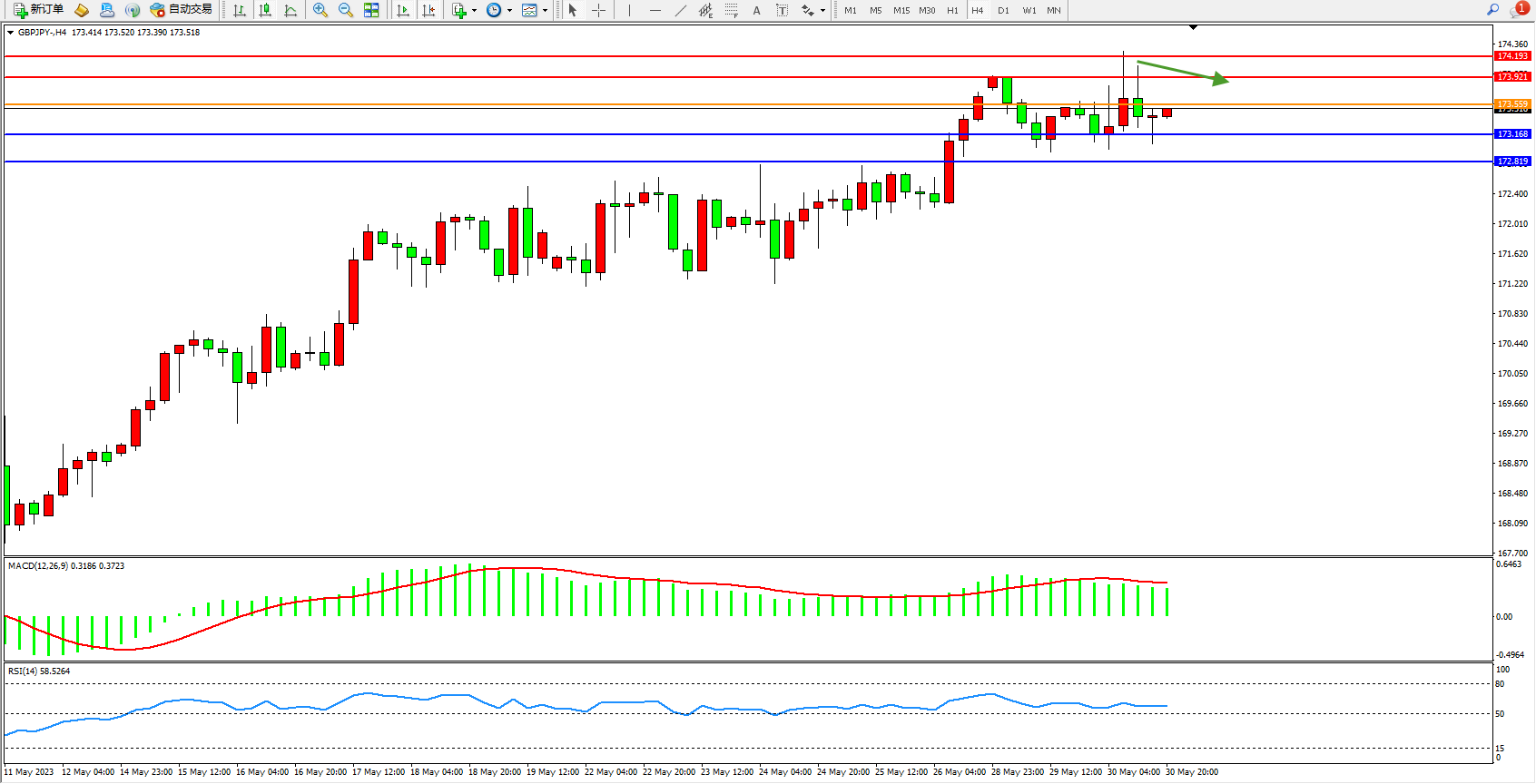 4小时图看:高位多头动力短期遇阻整理,市场看涨情绪开始逐渐减弱,MACD指标处于多头区域整理,RSI指标处于50均衡线上側弱势徘徊;