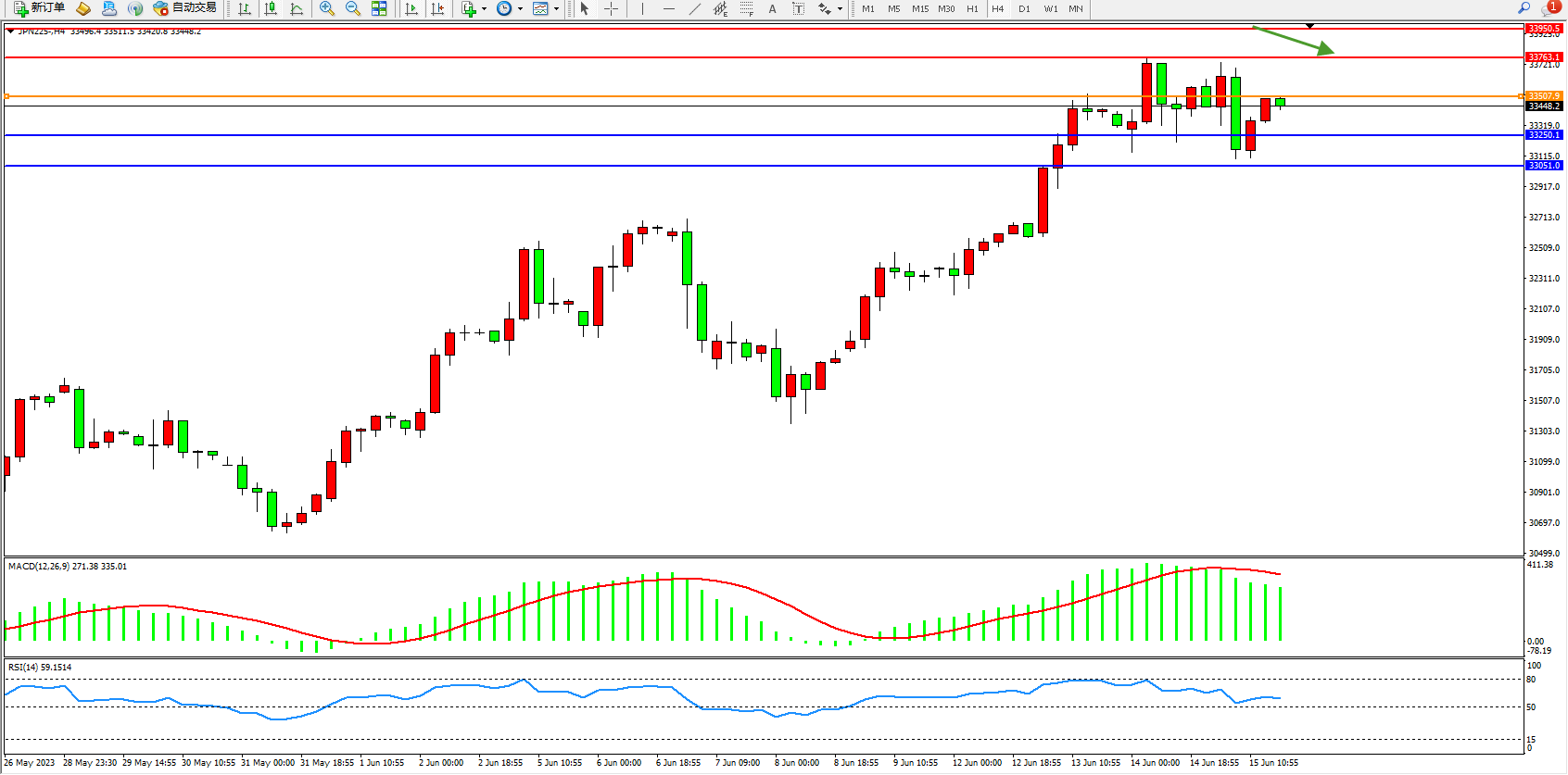 4小时图看:高位短期窄幅震荡,市场空头动力有伺机入场迹象,MACD指标处于多头区域缓慢下移,RSI指标处于50均衡线上側弱势整理;