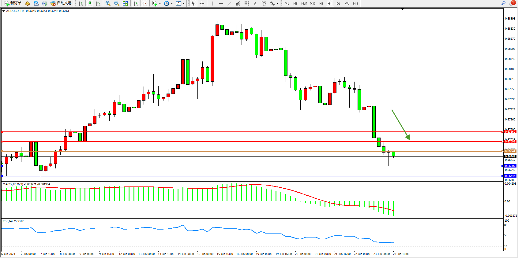 交易策略:0.66844下方看跌,目标0.66607 0.66444