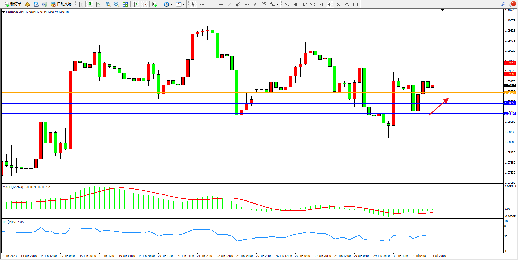 欧元美元EURUSD—4小时K线图显示: