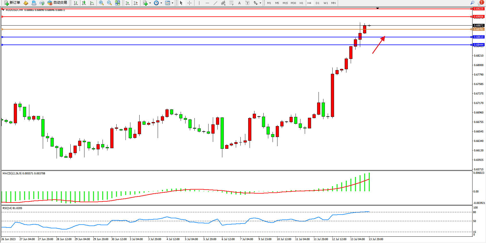 交易策略:0.68781上方看涨,目标0.69056 0.69225