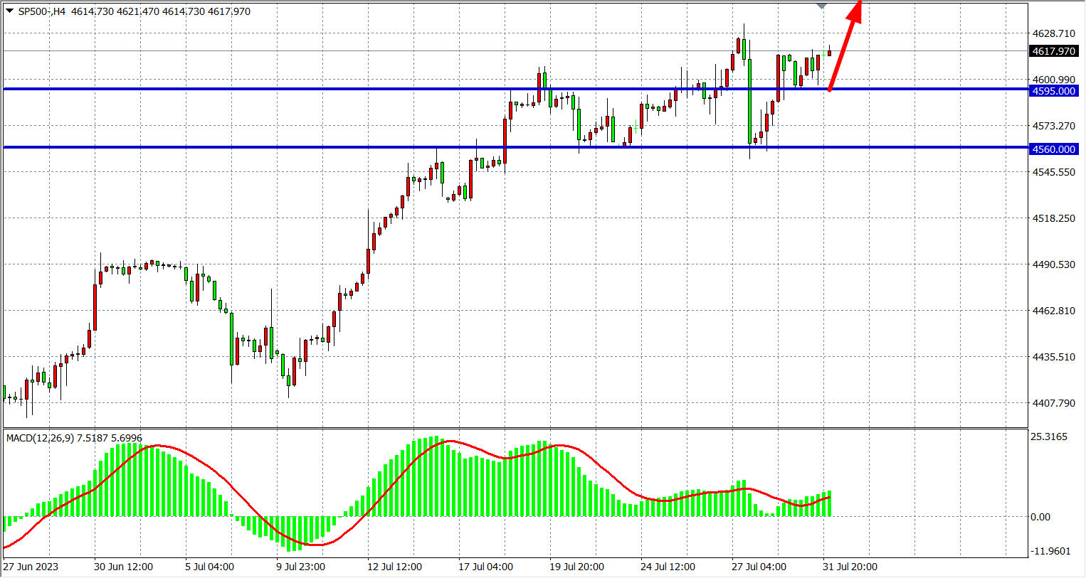 4小时图看,标普维持上行,MACD量能在零轴上均匀堆量,支撑关注4595-4560附近,上方阻力4630-4660。