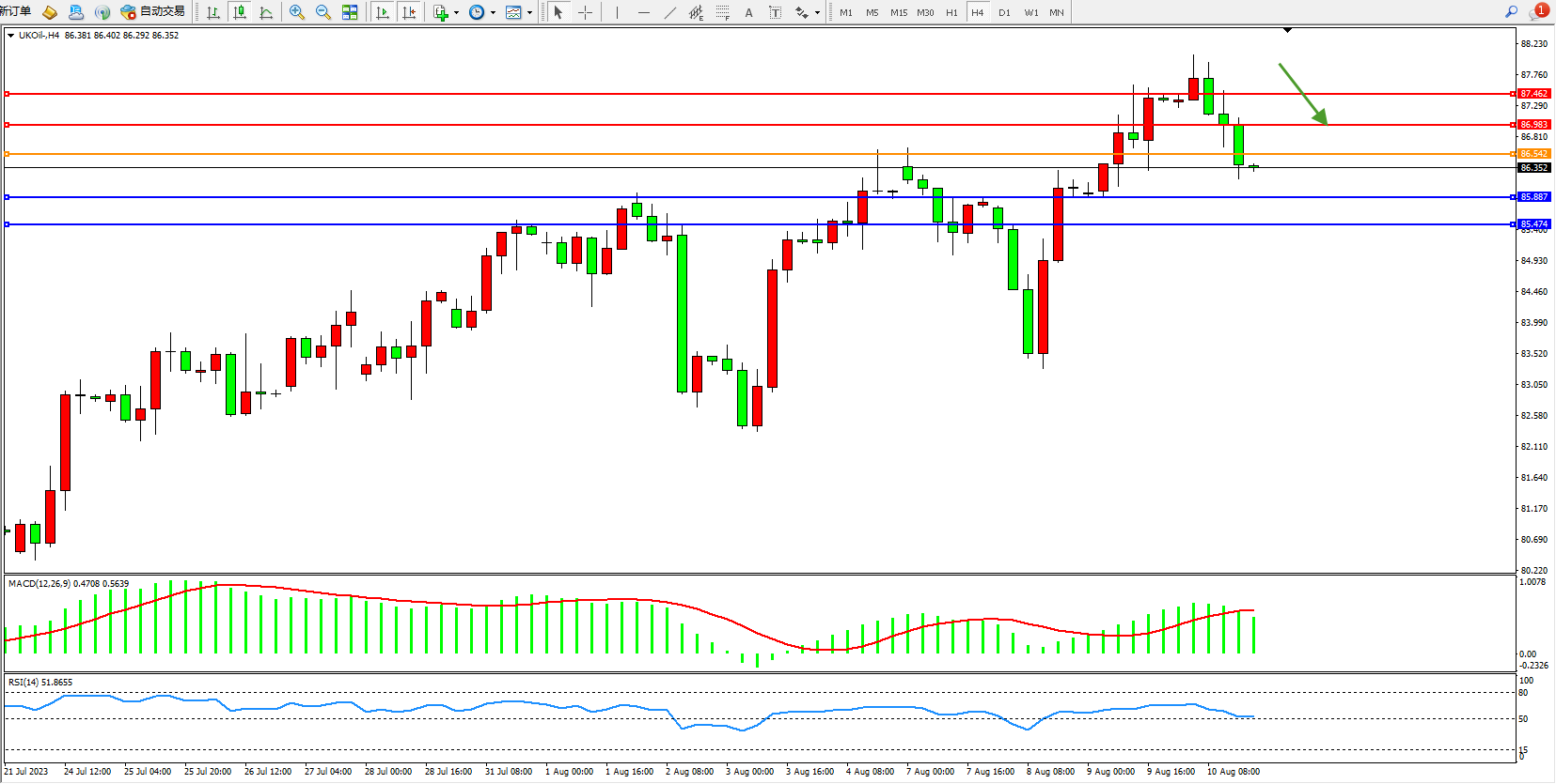 4小时图看:高位空头震荡不断下行,短期跌势持续,市场空头情绪笼罩,MACD指标处于多头区域缓慢下移,RSI指标处于50均衡线附近弱势徘徊;