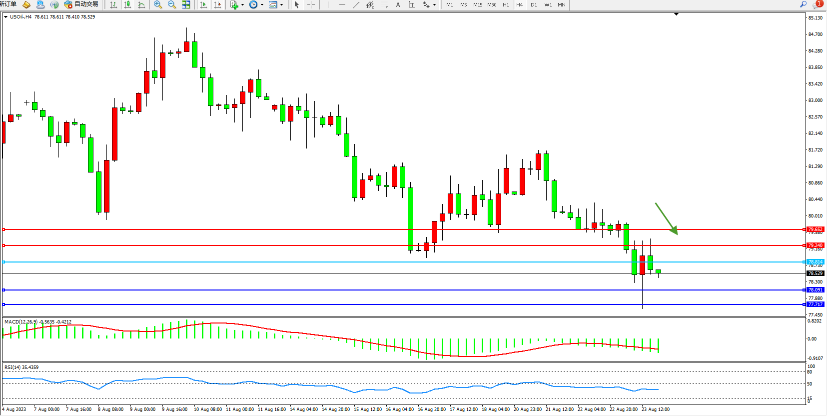 交易策略:78.814下方看跌,目标78.091 77.717