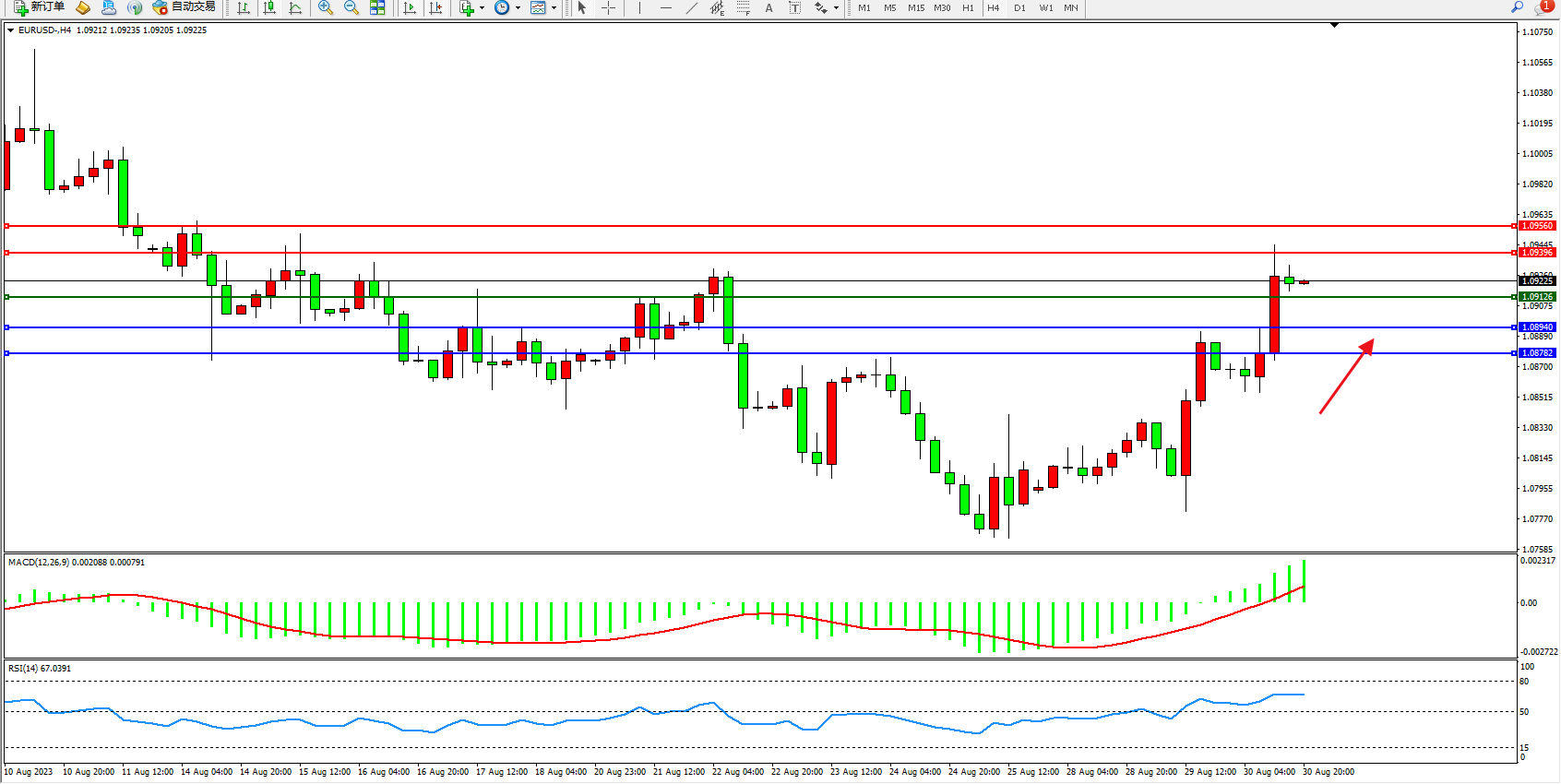欧元美元EURUSD—4小时K线图显示: