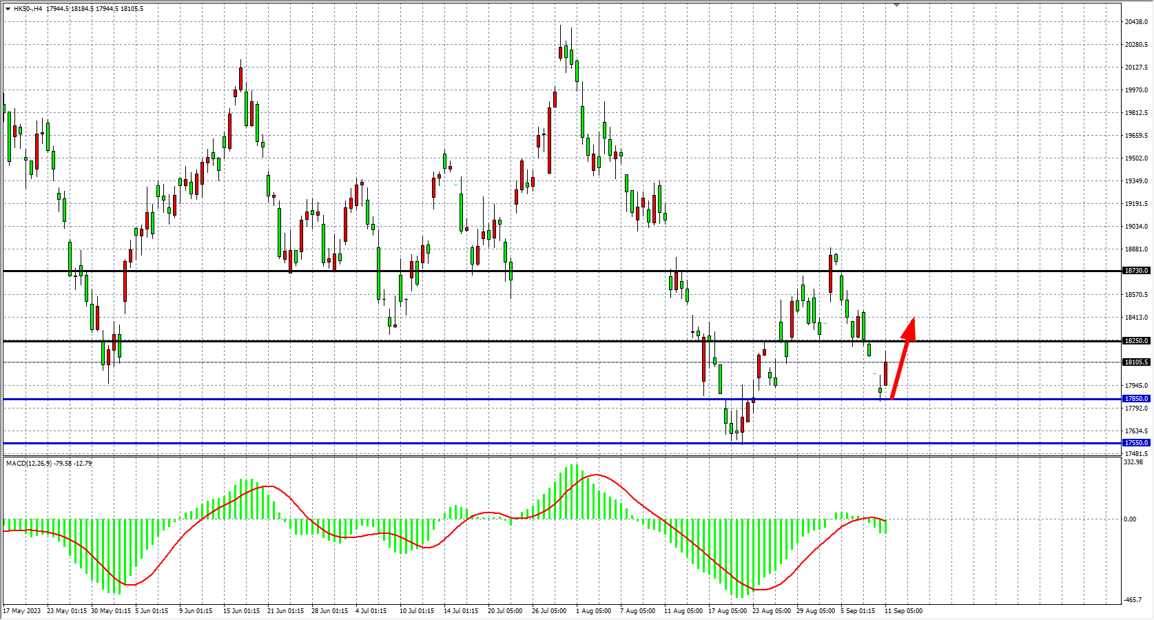 4小时图看,恒指低开后在17850获得支撑开启反弹,MACD量能于零轴下方有所缩减,短期走势方向尚不明确,支撑关注17850-17550附近,阻力关注18250-18500。