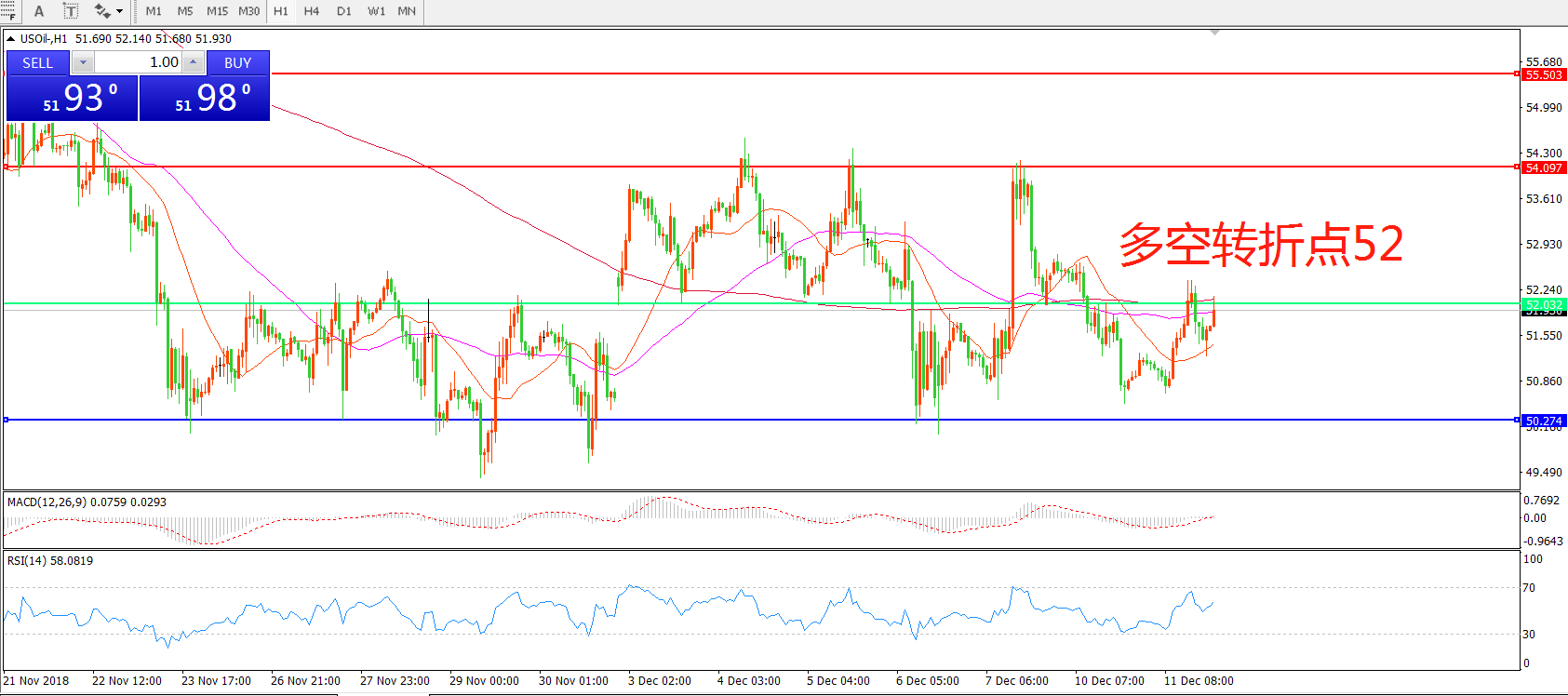 小时图看,油价冲高回落,最后收于均线系统之下,形态上呈现箱型震荡迹象,均线系统逐渐粘合,MACD绿柱缩短,红柱增加,重点关注多空转折点52美元一线得失