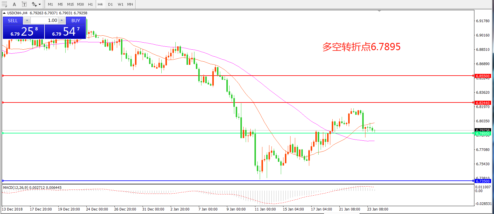 备选策略: 在6.7895之下,看跌,目标价位为6.7350,然后为6.7000